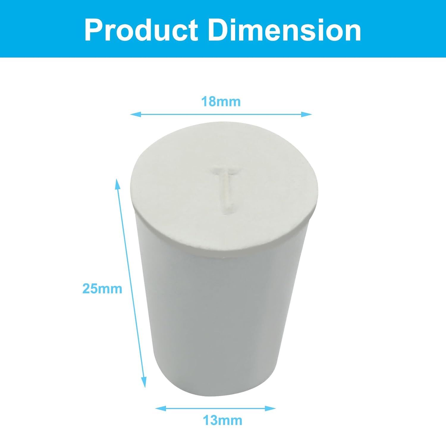 Specifications: 1# Solid Rubber Stoppers; Top Dia.(big-end): 18mm/ 0.71inch; Bottom Dia.(small-end): 13mm/ 0.51inch; Body Height: 25mm/ 0.98inch.