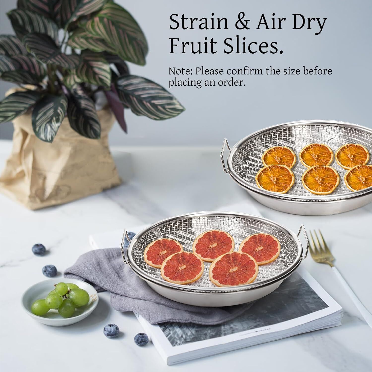 Practical Design: The kitchen strainer with tray is equipped with double ear, which is convenient for gripping and moving. Also, it can be hung and stored when not in use, which is space-saving. It comes with 3 feet which can raise the rack, keeping a better ventilation.