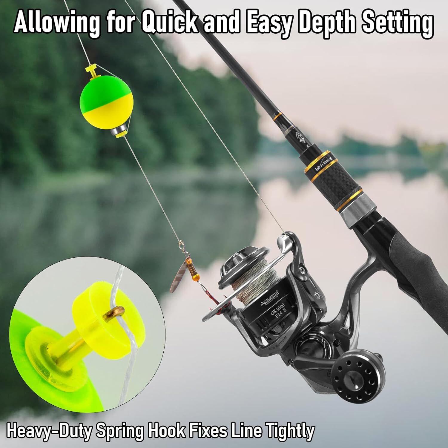 SNAP-ON FLOATS: Equipped with a heavy-duty spring fixed design, the top and bottom spring hooks can be easily pushed open and release closed, allowing for quick and easy depth setting, keeping the hook and bait at the required depth.