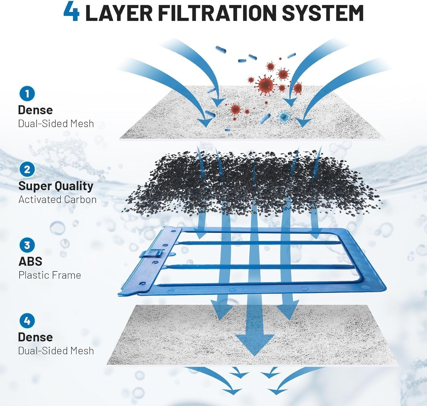【Durable design, durable stability】 : Built-in ABS frame, uniform distribution of activated carbon and filter media, to ensure that every drop of water is fully filtered. ABS plastic edges are more durable and resistant to deformation, making them a perfect fit for Whisper filters