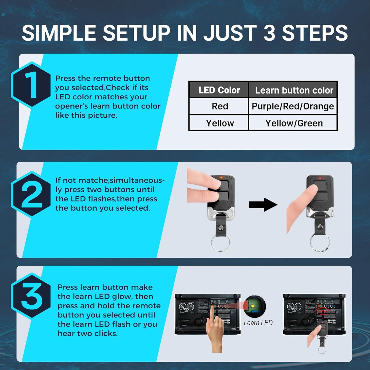 Easy to Set and Use:With its dual-color LED light design, the pairing process of the garage door becomes clearer and simpler. Say goodbye to complicated setups and enjoy a more pleasant and convenient user experience.