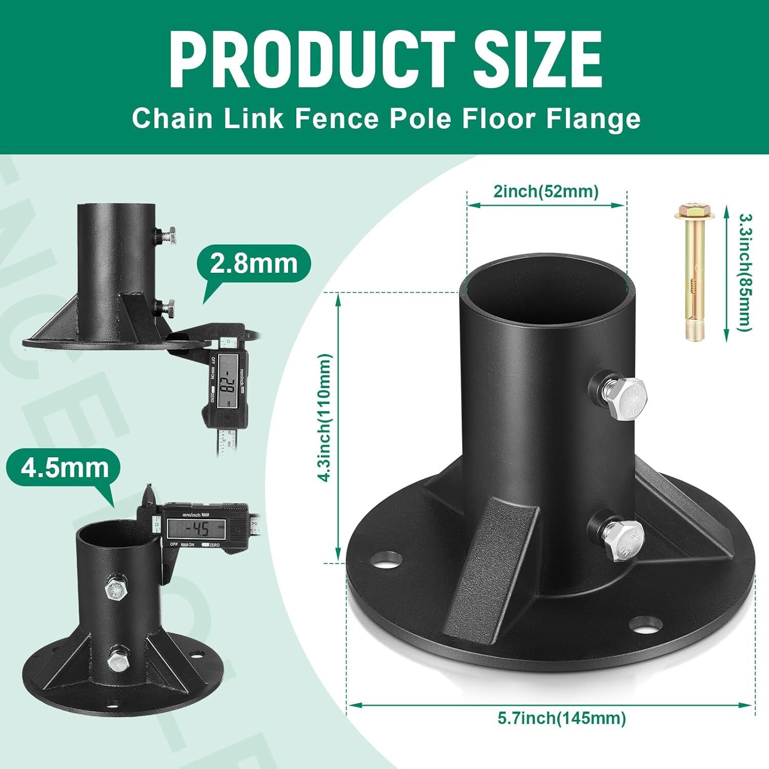 Quality and Durability: constructed with impressive 0.16 inch thick steel, our floor flanges promise enduring robustness; The power coated black finish not only adds to its aesthetic appeal but also boosts the product's longevity, suitable chain link fence post, lamp post, mailbox post, and numerous other steel round post applications