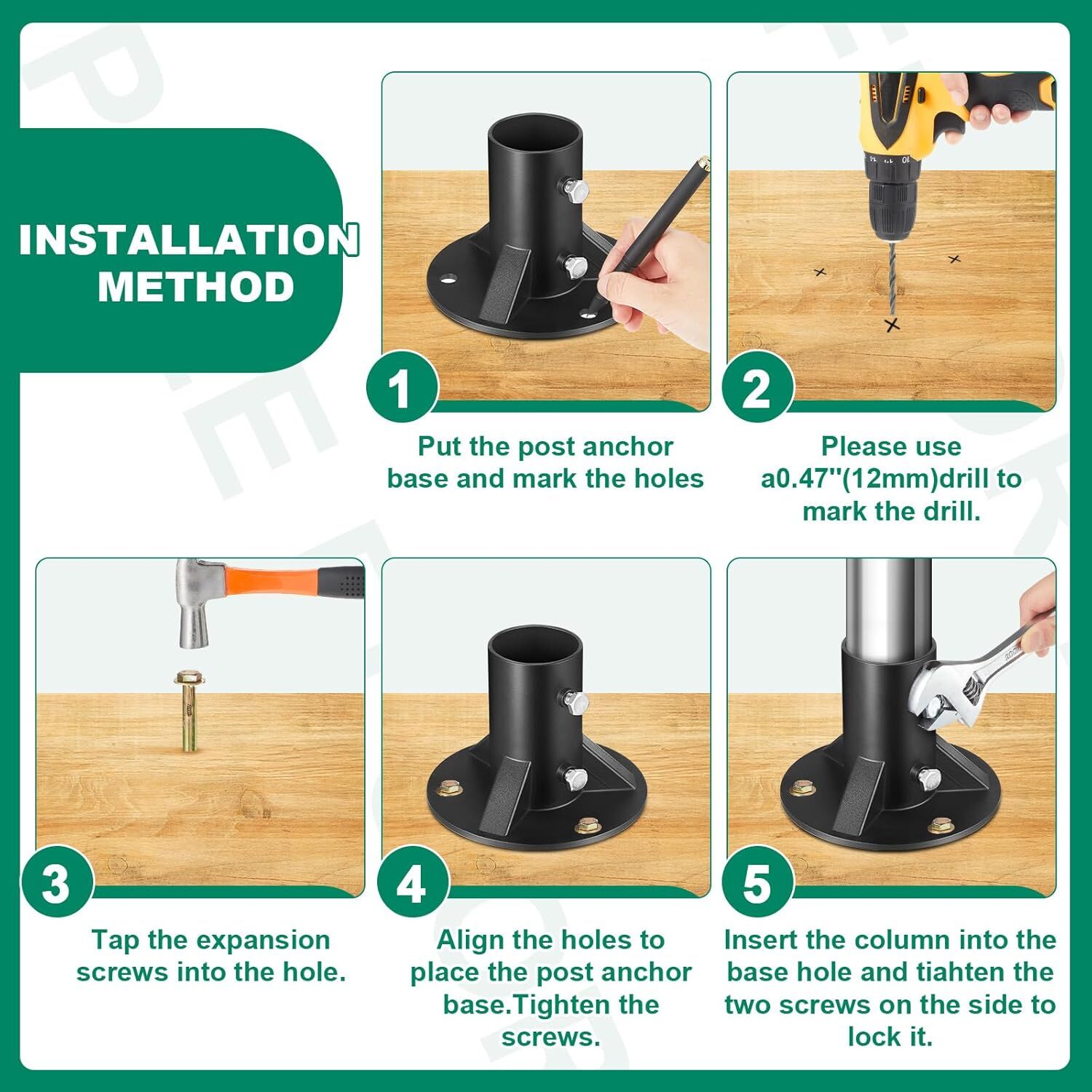 Effortless Setup with Pre Drilled Holes: experience effortless installation with our pre drilled 0.47 inch hole; Simply align the flange base on the floor, mark the holes' position, secure it in place with the expansion bolts, and slide the post in; Tighten everything up with the two side set screws for a firm and secure setup