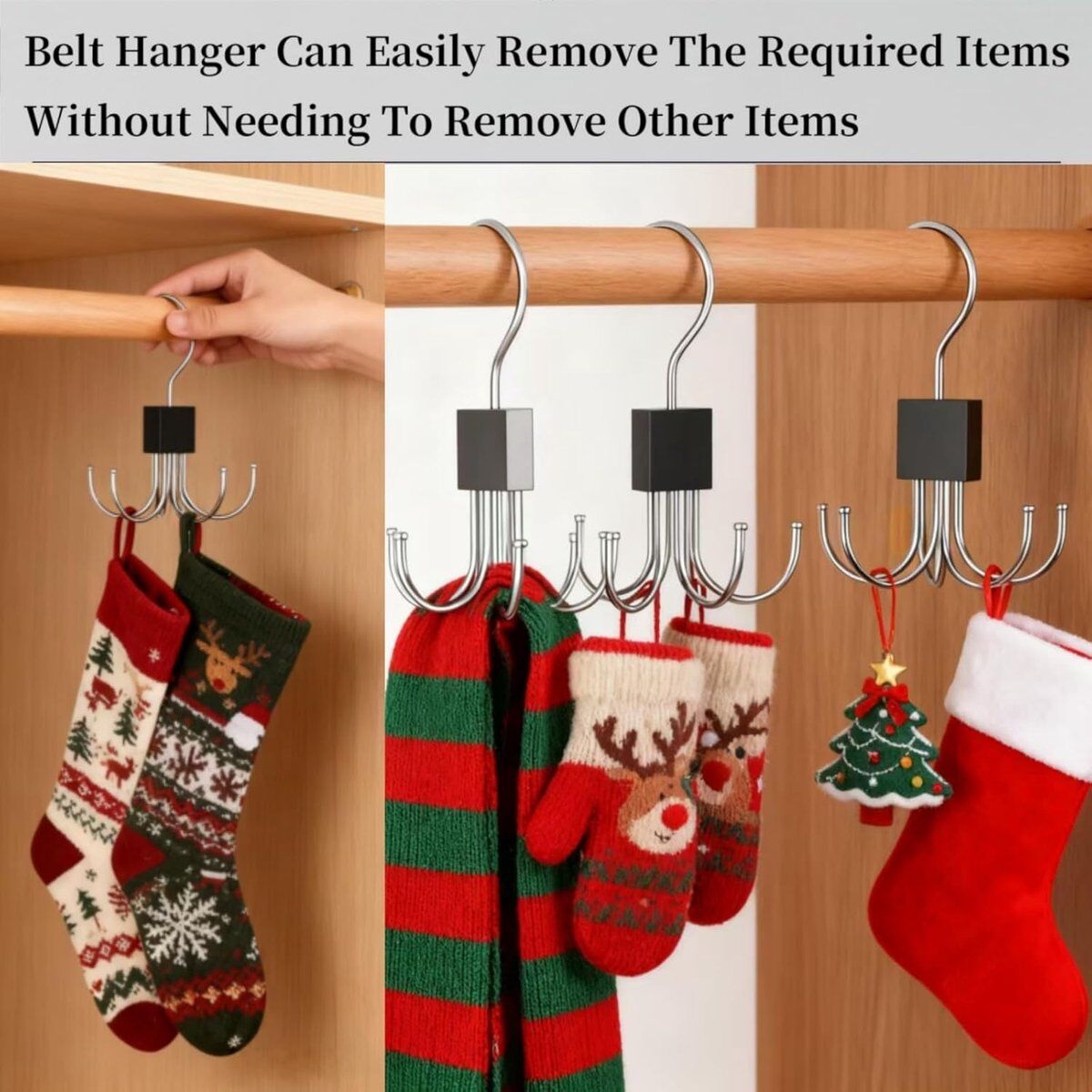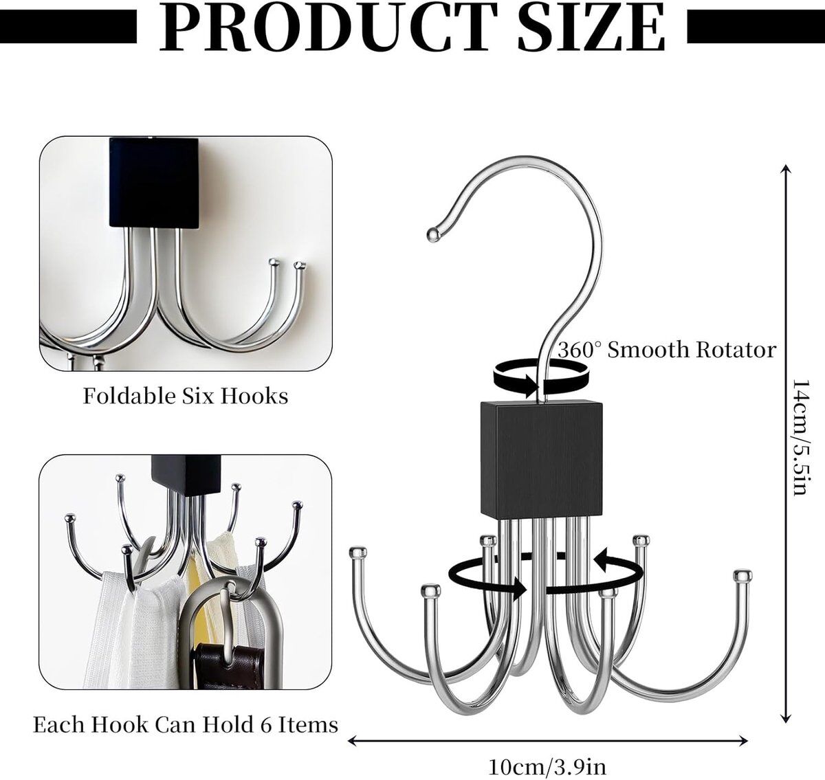 Belt Organizer: The closet belt organizer is equipped with 6 metal, curved hooks with improved grip technology to prevent slipping and securely holds bras, belts, scarves, wallets, etc. Rotating Metal Organizer: The smooth 360° rotator allows you to browse and access belts, bras, ribbons, etc. without removing adjacent items. Closet Belt Holder: The tank top hanger with six hooks prevents tipping. The low center of gravity ensures even weight distribution and prevents tilting. Metal Bra Organizer: Tool-free assembly, suitable for storing clothing items such as belts, ties, hats, scarves, cardigans, and camisoles, and can also be used for storing necklaces, hairbands, and bath towels.