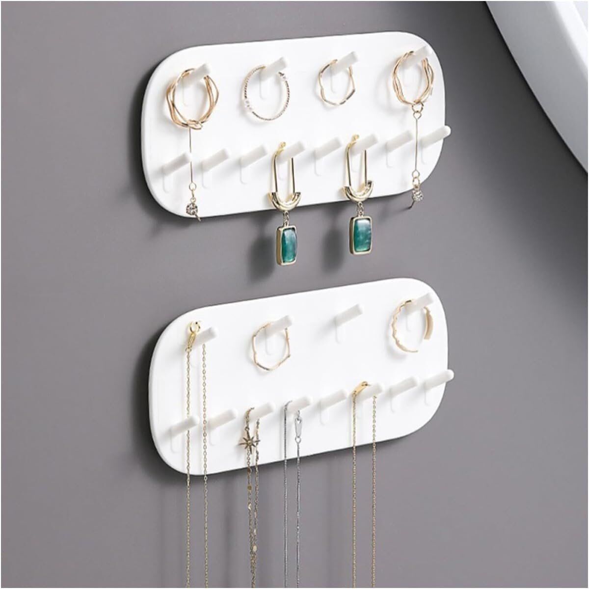 Premium Materials: This necklace rack is made of plastic and features a compact and practical design that takes up little space. The small hooks are lightweight and durable. Unique Design: This necklace rack has a beautiful and compact design, allowing you to say goodbye to the hassle of tangled necklaces and bracelets. All your necklaces and bracelets can be stored in a relatively compact, neat, and easily accessible space. Say farewell to the hassle of searching through a jumble of boxes to find specific pieces or untangling countless necklaces. Perfect Gift: This jewelry rack has a classic and stylish look and can also serve as home decoration, creating an elegant atmosphere. It is an ideal gift for a girlfriend, daughter, mother, jewelry lover, or teacher. A jewelry rack is also a great gift choice for family and friends. Easy Installation: Simply use the included stickers. No drilling is required, and it will not damage your walls. Remove the stickers, stick one side to the rack, and the other side to the wall or table where you want to hang it. Versatile: Our self-adhesive wall hooks can be used as clothes hangers, jewelry organizers, coat racks, coat towers, or for organizing scarves, handbags, hats, bags, photos, wires, ropes, and other household items.