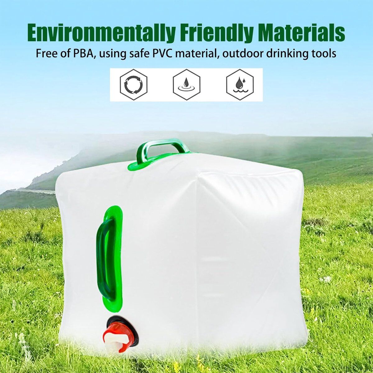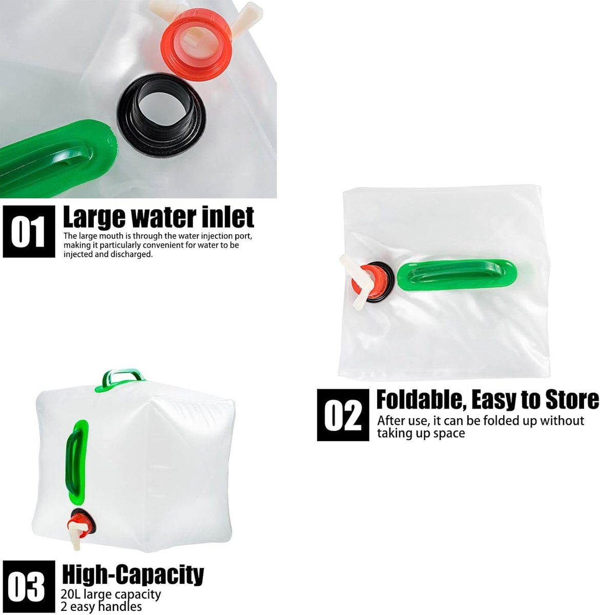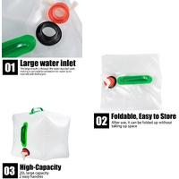 Package contents: The package contains 1 20-liter foldable water container to meet your specific needs. High quality: Our foldable water container is made of food-safe PVC material, BPA-free, odorless, and tasteless, and does not affect the taste of the water. The one-piece construction makes it leak-proof and durable. Leak-proof tap and portable handle: The 20-liter camping water container is equipped with an easy-to-open water spout, which is leak-proof and easy to fill and dispense water. For large-capacity foldable, portable water tanks, the double handle design makes operation easier. Foldable and space-saving design: Our lightweight and portable foldable water container saves storage space and can be carried in a backpack or car. It is very convenient to use. Great for daily use, outdoor use, and emergencies: This foldable water bottle is perfect for daily use, outdoor activities such as camping, hiking, picnics, barbecues, sports, parties, as well as for emergencies such as earthquakes, floods, etc.