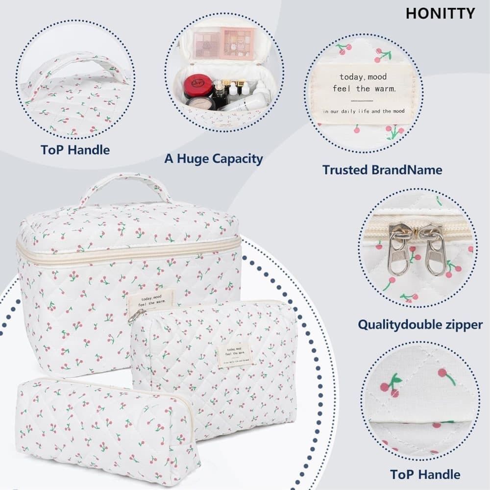 Premium cotton cosmetic bag set with elegant floral design, featuring three practical sizes for versatile storage solutions.