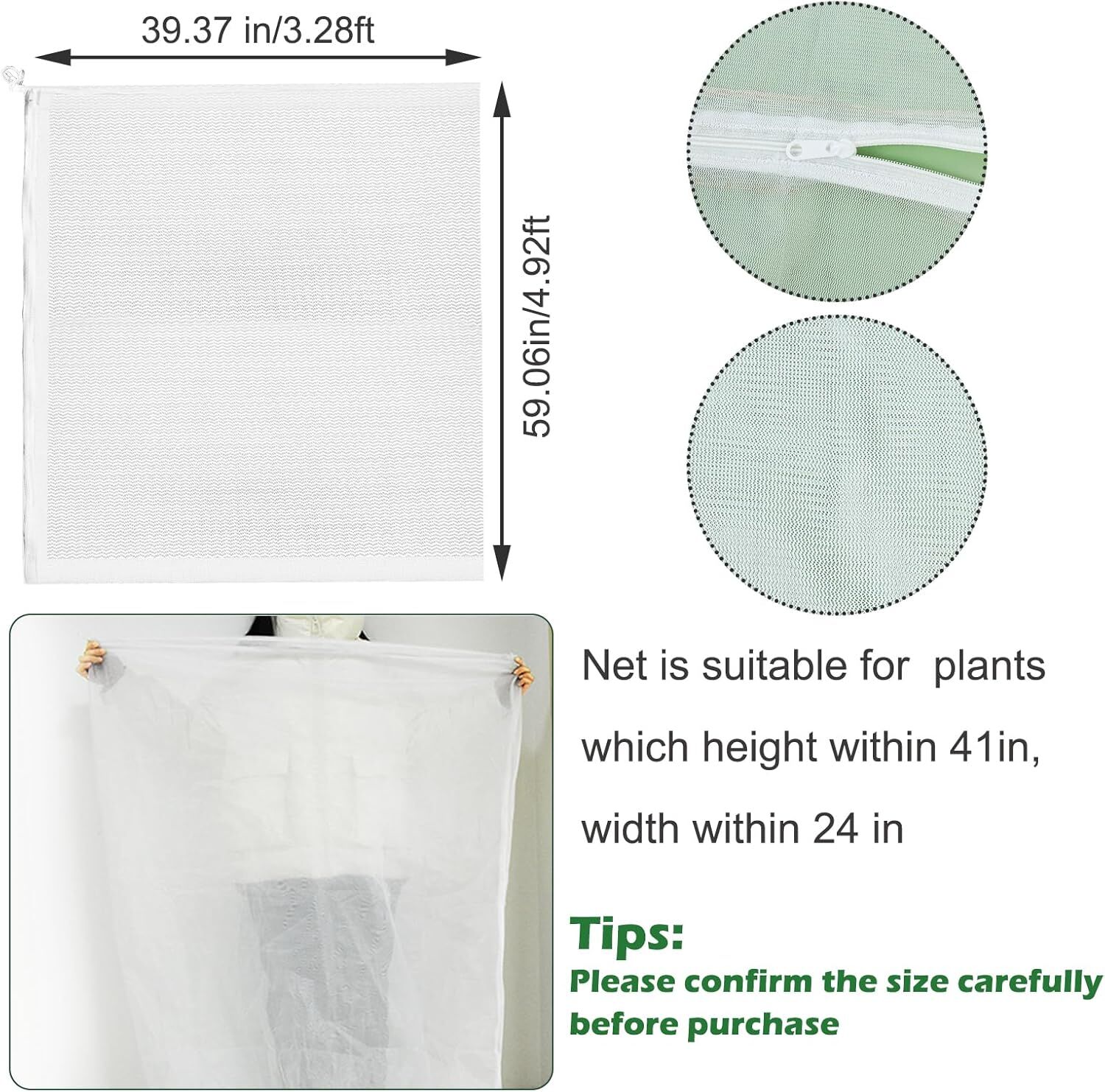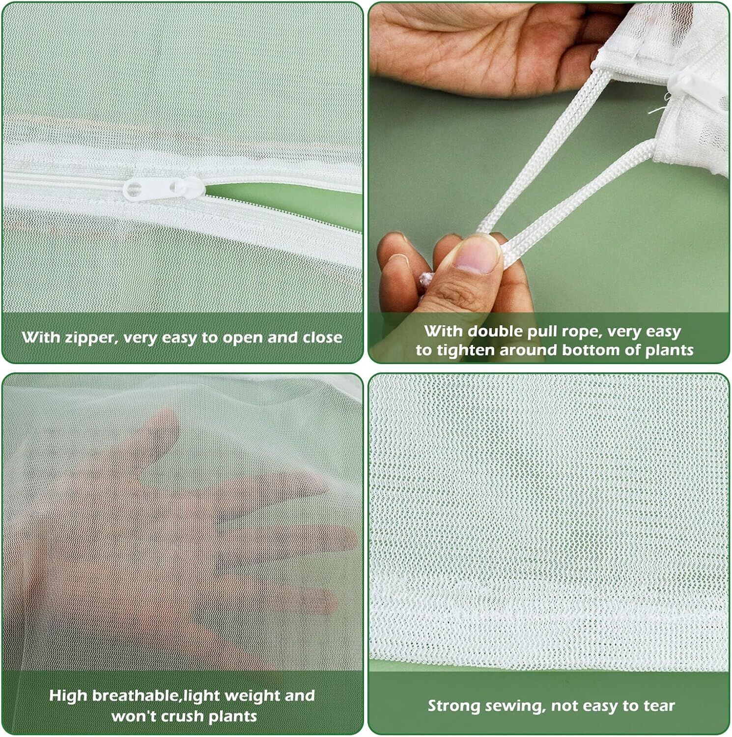 Zipper Design- Comparing with other plant netting cover, we designed a zipper on the blueberry bush cover, this zipper helps you check your plant easily without taking off the whole birds barrier netting.