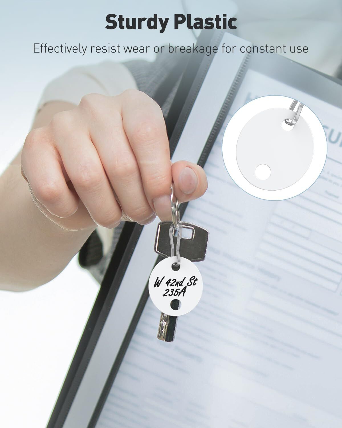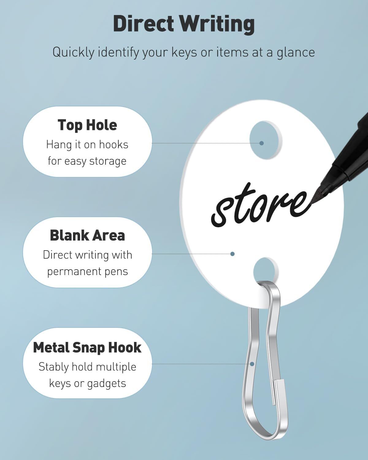 Quick Identification: The plastic key tags feature blank central space on both sides. Just number the tags and write with permanent marking pens. Quickly identify your keys or items at a glance.