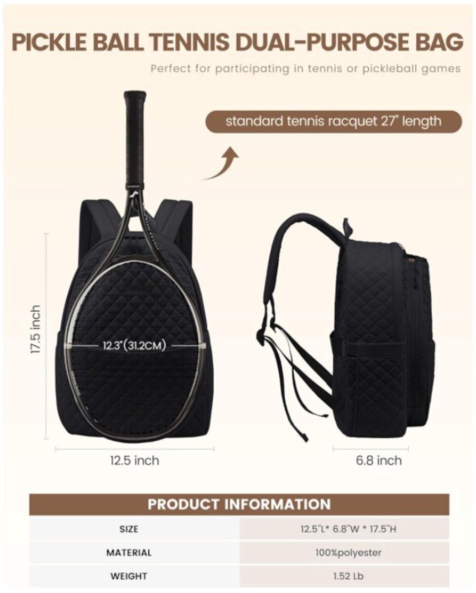【High-Quality Materials】: The tennis pickleball backpack is made of premium polyester, which ensures durability and tear resistance for daily use. It is lightweight and easy to carry, making it the ideal companion for both pickleball and tennis activities. 【Large Capacity】: Our women's tennis bag features a spacious design, including two main compartments that provide ample space to easily store all of your tennis or pickleball accessories. In addition, the tennis bag is equipped with seven pockets, including two easy-access external side pockets for water bottles and an anti-theft pocket on the back. The main compartment also includes a padded sleeve for a laptop up to 14 inches. 【Multifunctional Tennis Bag】: The main compartment of the tennis bag is equipped with a key ring, so your keys are always within reach and safely stored. The luggage strap on the back allows you to effortlessly attach the bag to your rolling suitcase, making it the perfect travel companion. Additionally, the removable hook at the top allows you to easily hang your items on sports field fences or sports hall walls, keeping your gear organized and accessible during matches or training sessions.