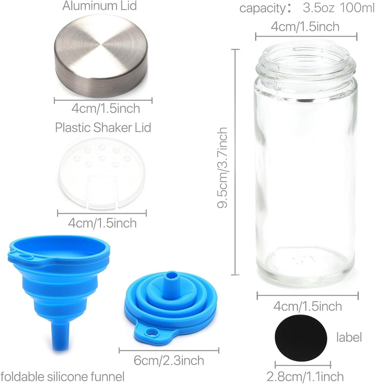 • PREMIUM FOOD-GRADE GLASS & ALUMINIUM LIDS: Each jar is made from thick, BPA-free, lead-free, food-grade glass for long-lasting clarity and safety. The aluminium lids feature airtight silicone seals that preserve the freshness, aroma, and flavor of your favorite spices and herbs.