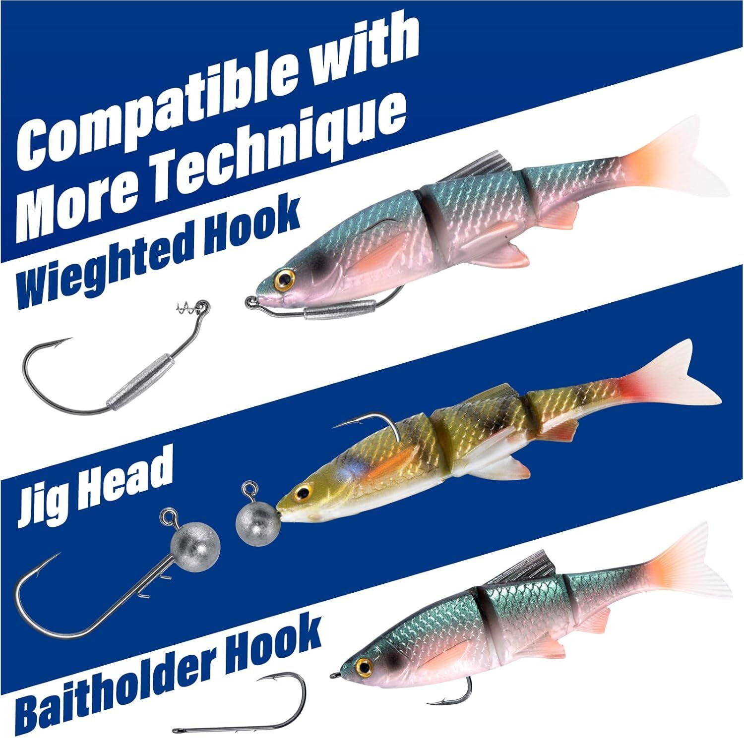 PREMIUM MATERIAL: Our swimbaits are made of high-quality PVC material, which can withstand harsh conditions and multiple fierce bites from prey. The surface is covered with natural grease to maximize the reproduction of real fish visually. Durable and not easily deformed.
