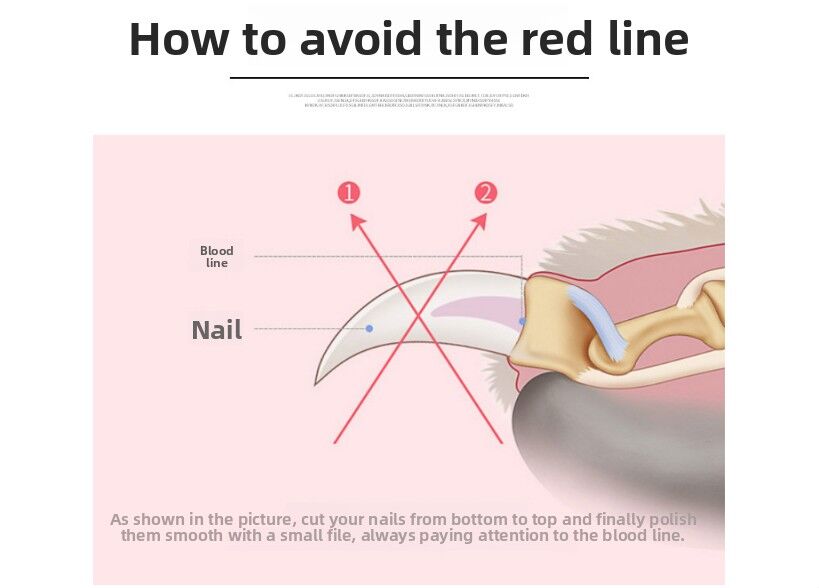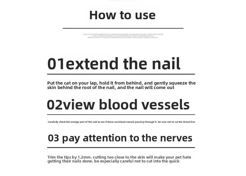 This item is intended for use under adult supervision. When trimming, hold the paw firmly and cut the nail at a 45-degree angle. Be careful to avoid the bloodline (the pink part inside the nail). For pets with dark nails where the bloodline is not visible, trim only a small amount at a time. Keep this product out of reach of children and lock the blades when not in use.