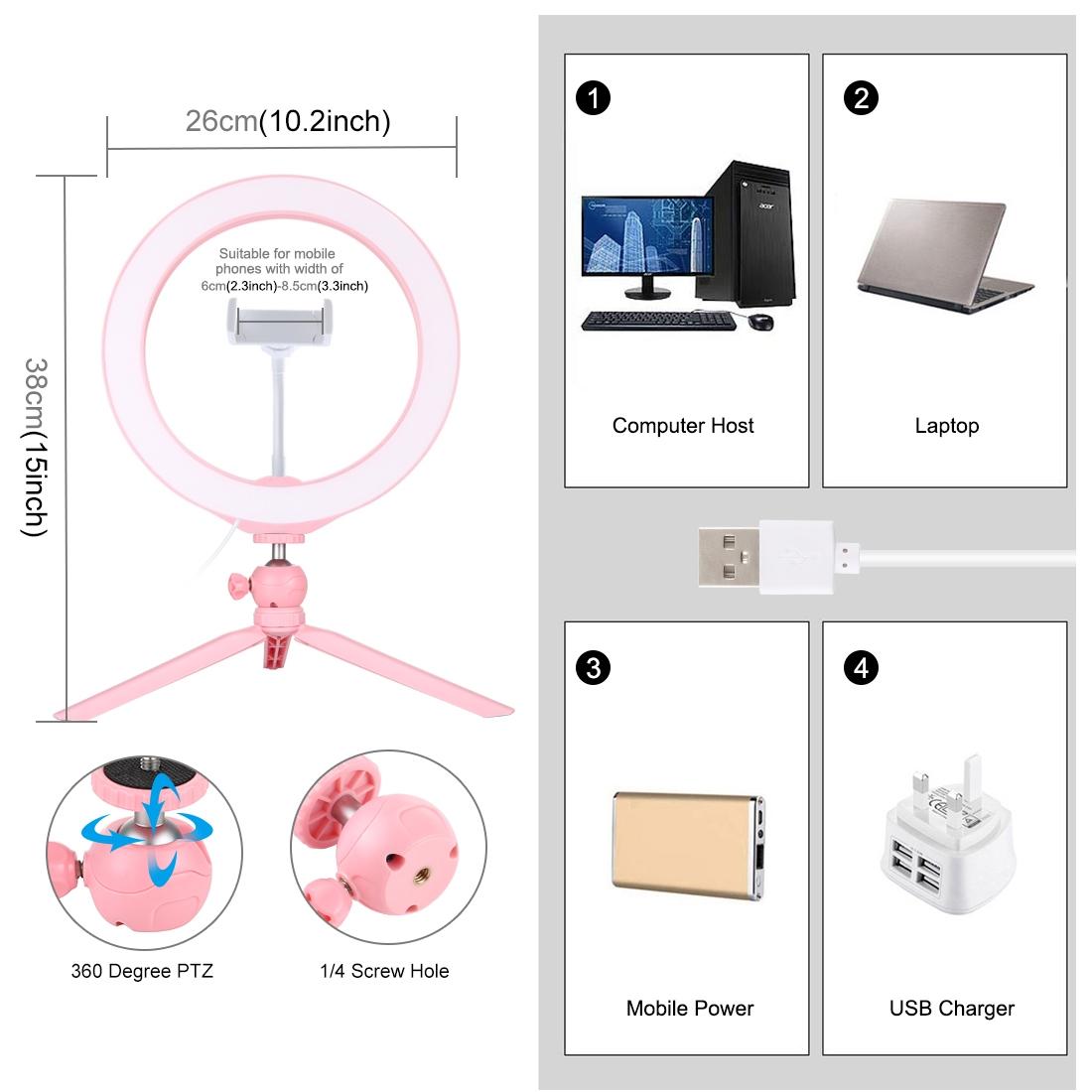 • 1 x 10.2 Inch 26Cm Selfie Beauty Light Desktop Tripod Mount Usb 3 Modes Dimmable Led Ring Vlogging Selfie Photography Video Lights With Cold Shoe Tripod Ball Head Phone Clamp