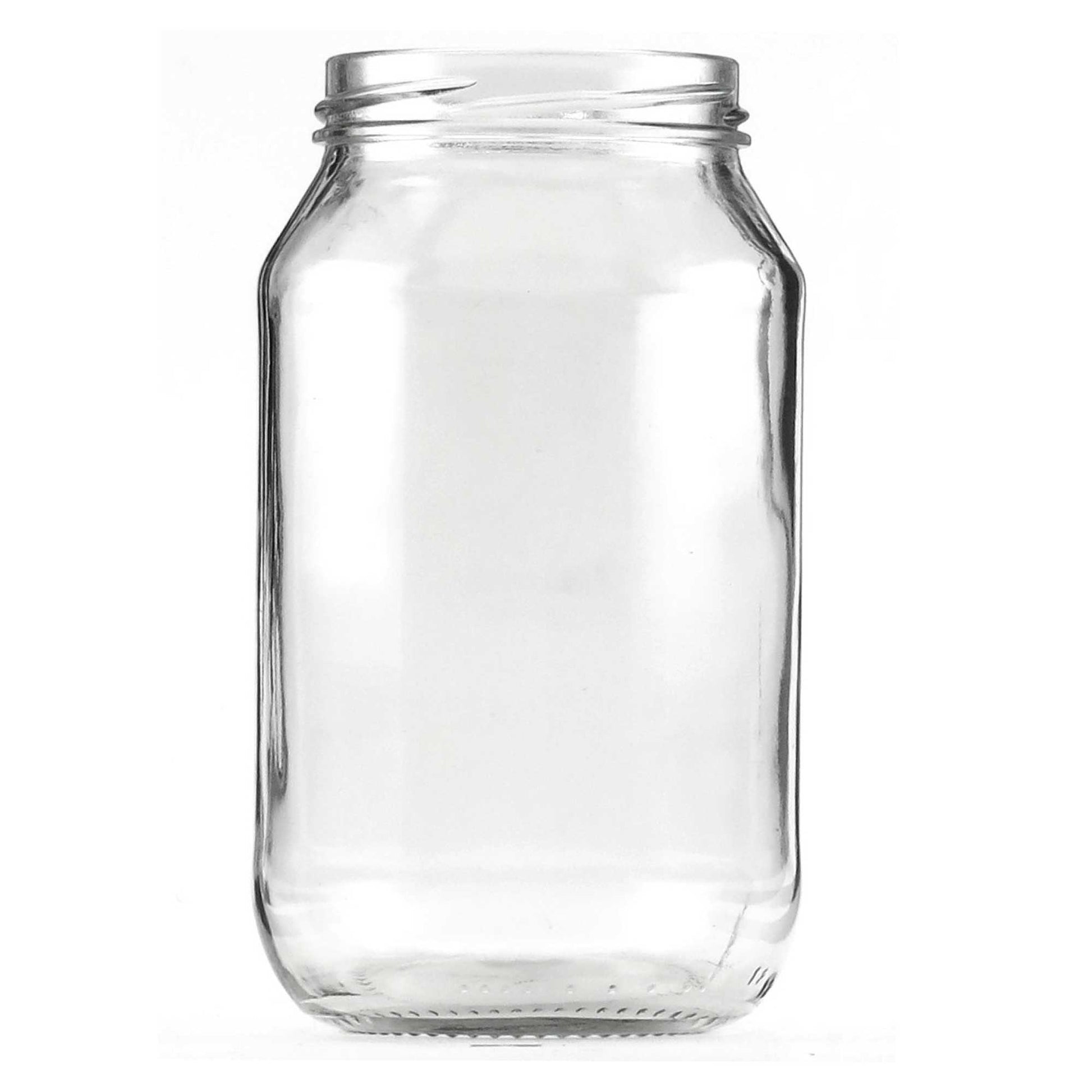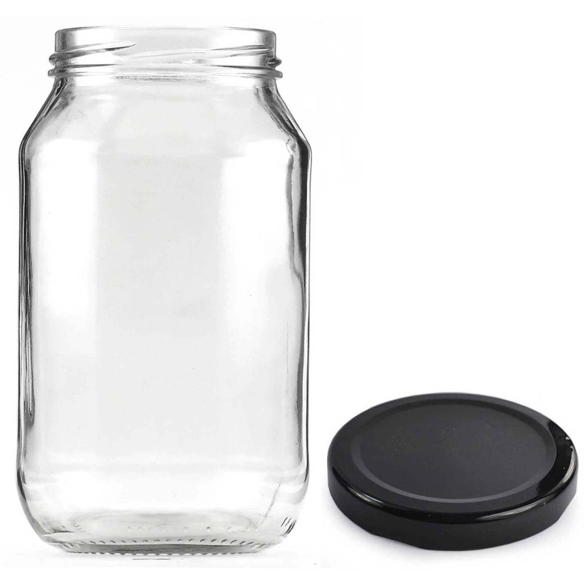 Empty 1L Round Flint Glass Jars with black metal twist finish lids. Commonly used for food products, preserving or packaging due to their wide neck finish. This closure has a puff compound for high acid resistance and can be used for cold or hot fill, either hand or machine applied.