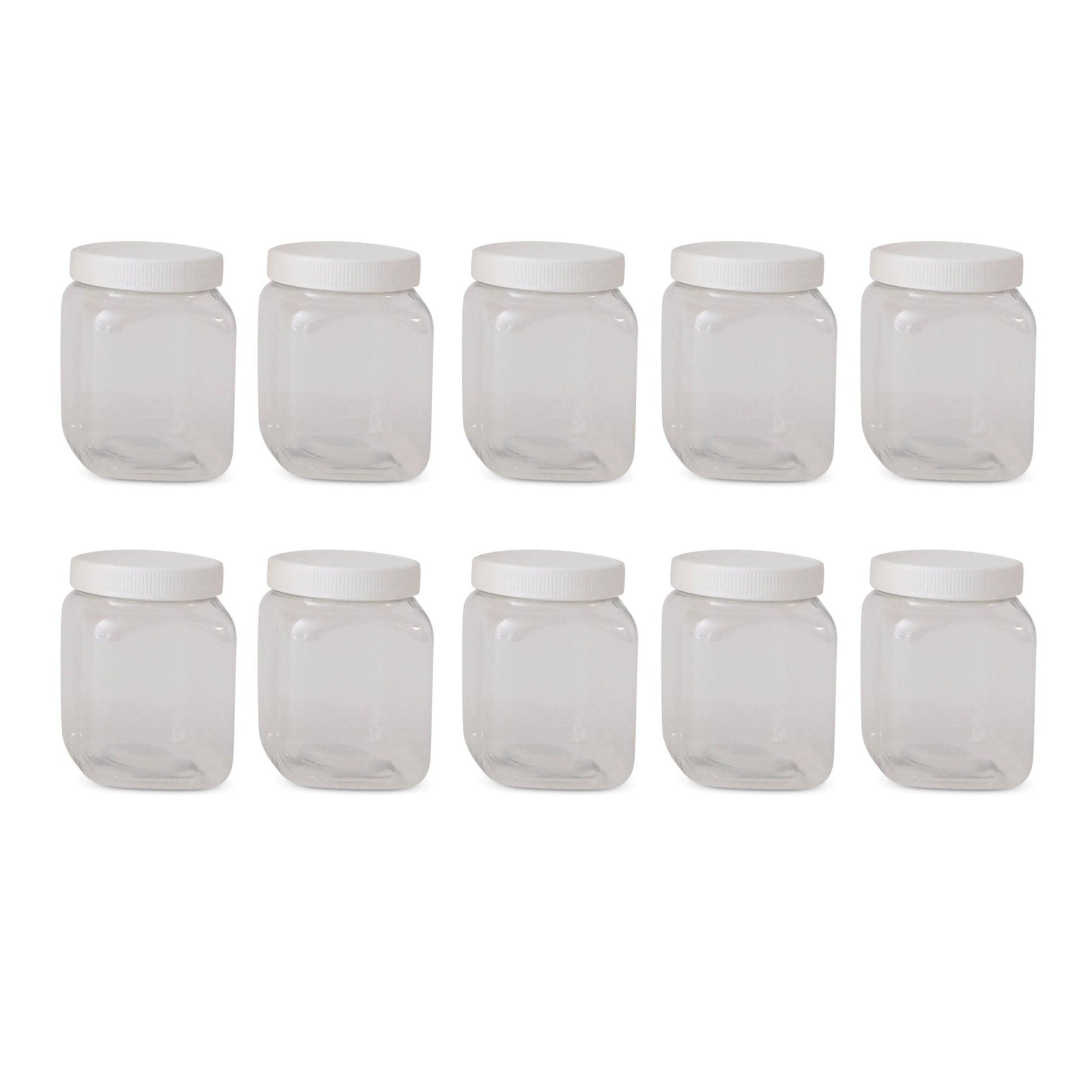 Square plastic empty food grade jars with white lids, commonly used for packing food products and items such as beads, crafts, decorations, honey, grains, beans etc.