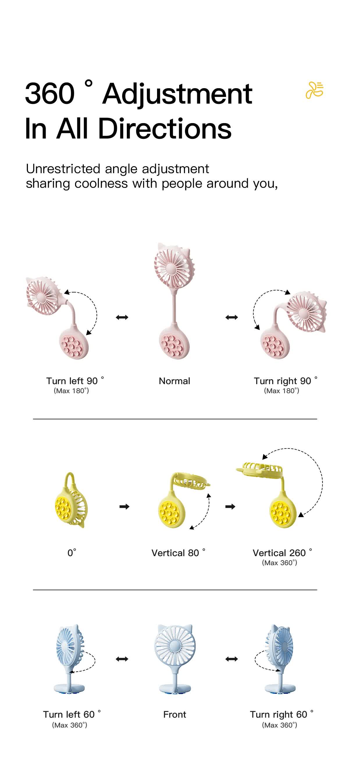 - 360-Degree Adjustable Design: Rotate and tilt the fan to any angle for personalized airflow.