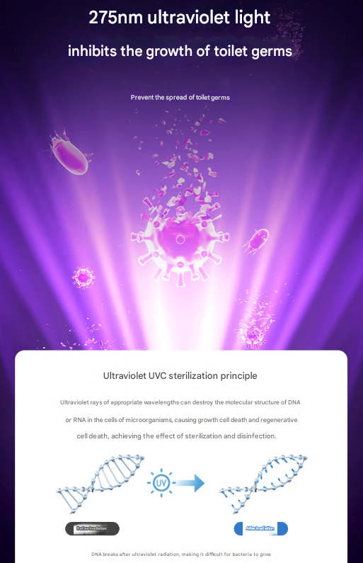 - Powerful UVC Sterilization: Equipped with potent UVC LED lights (275nm wavelength) that effectively disrupt the DNA and RNA of bacteria and viruses, inhibiting their ability to reproduce. It offers a physical, chemical-free method to keep your toilet sanitized.