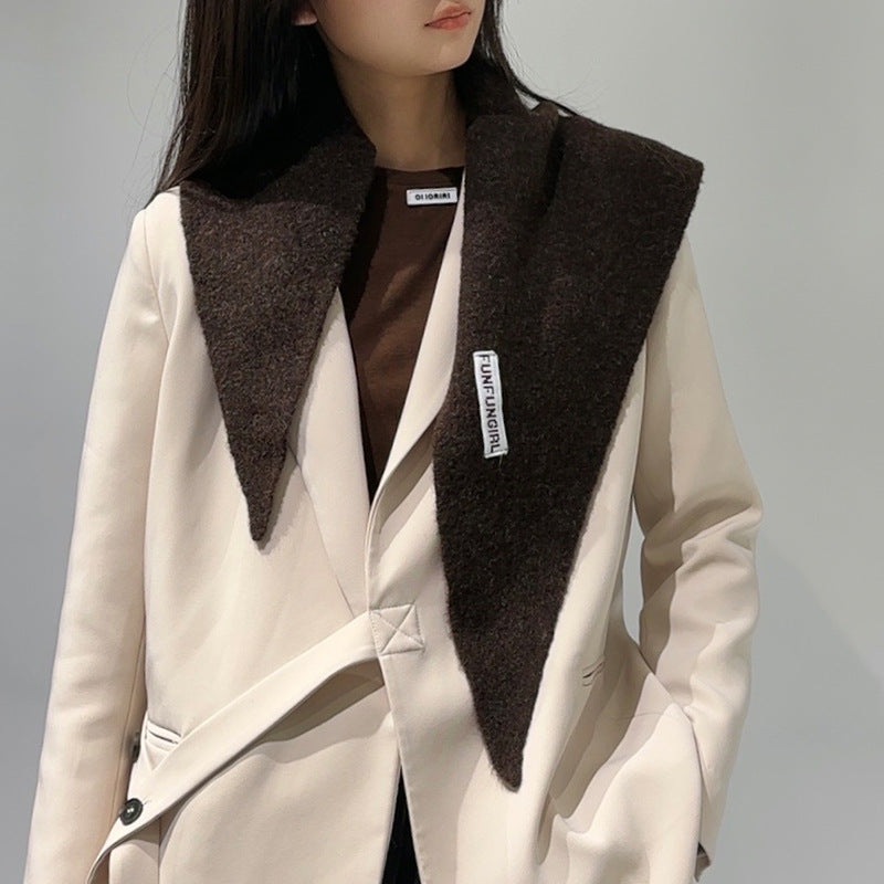 Elevate your autumn and winter wardrobe with this sophisticated wool blend triangle scarf. Crafted from a thick and cozy knit, this shawl offers both warmth and style. Its simple yet luxurious design makes it a versatile accessory for any occasion.