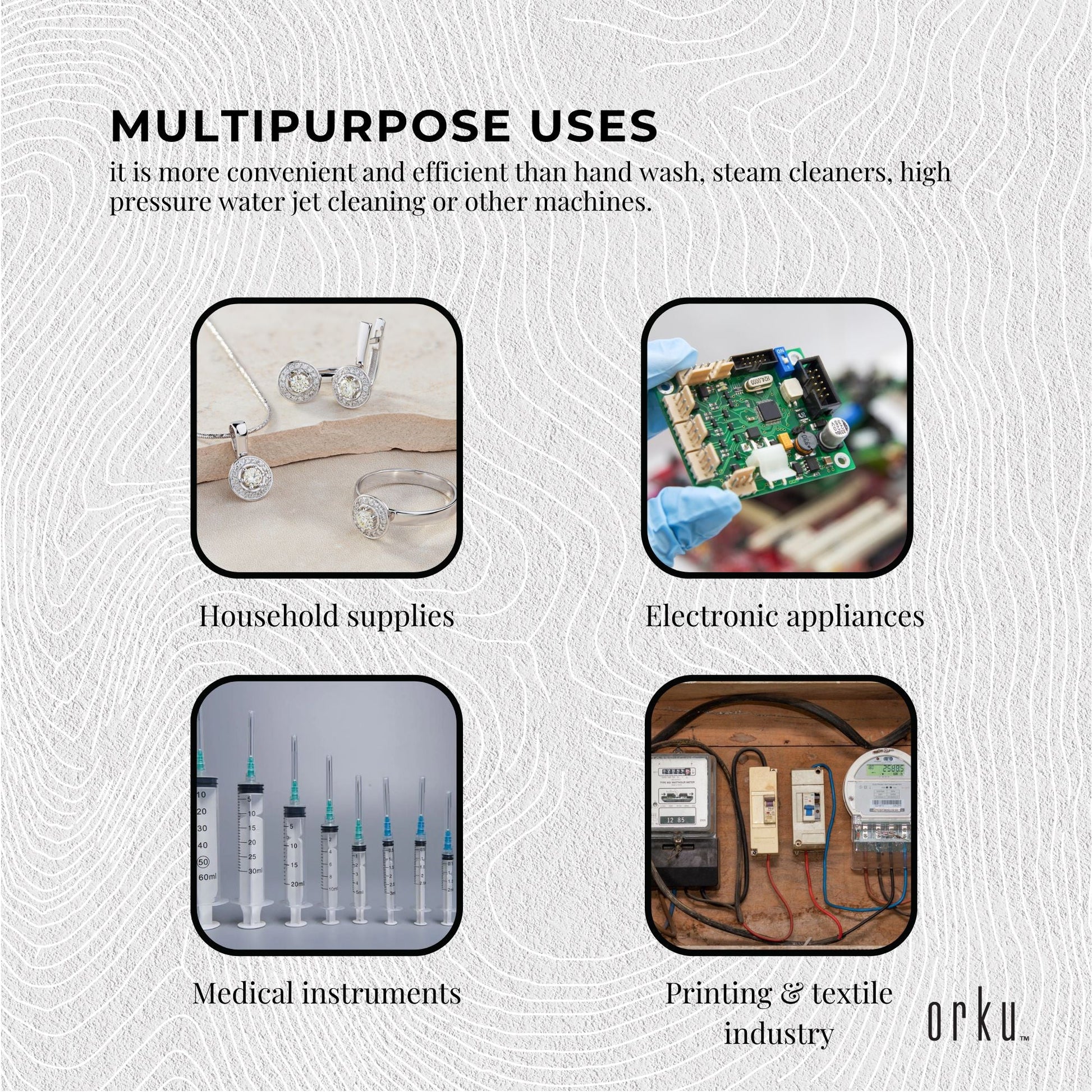 - Watches and Jewellery industry: Remove paint, spray paint, compound, oil sludge, dust, oxide layer, polishing paste on jewellery necklaces, jade articles, watches, glasses, etc.