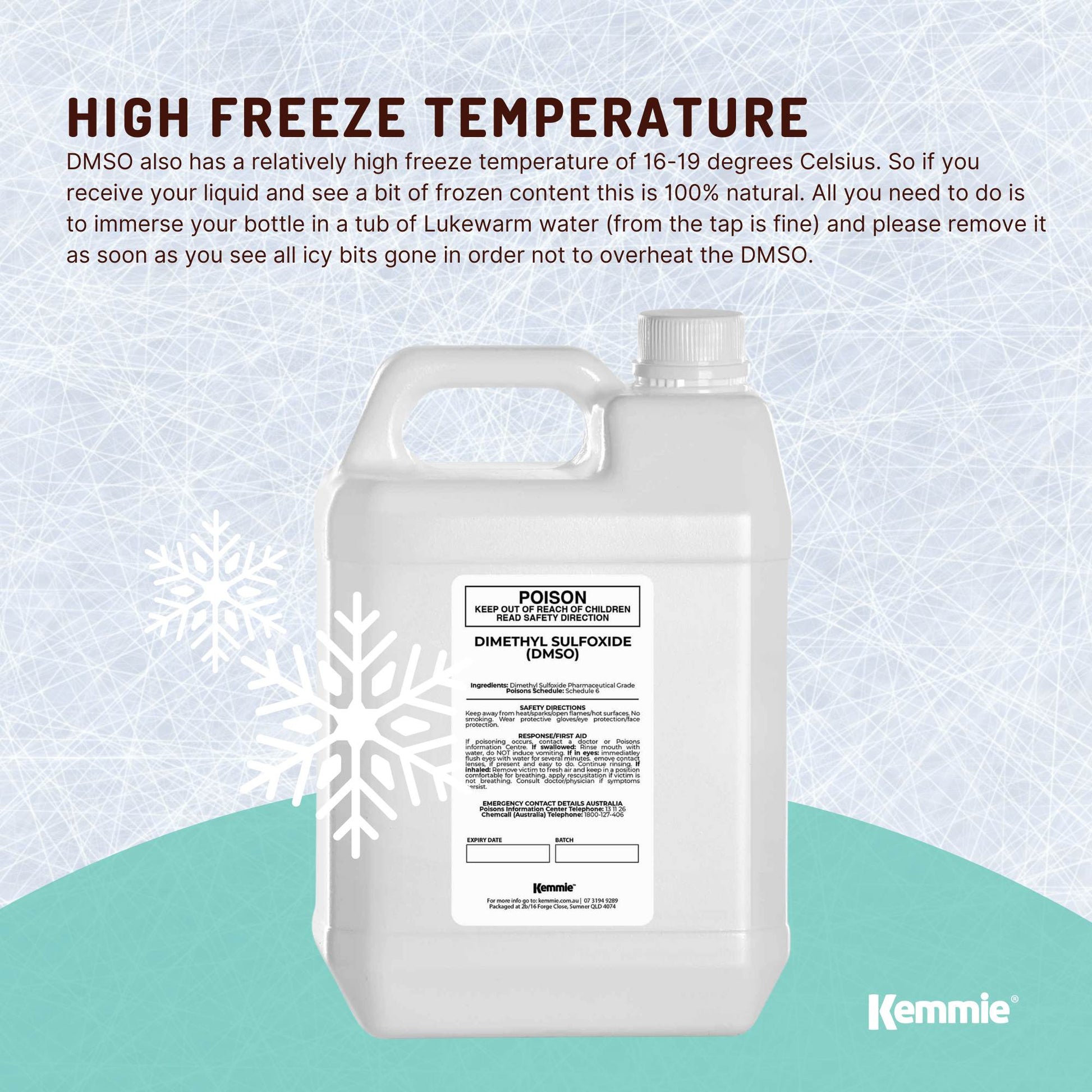 DMSO also has a relatively high freeze temperature of 16-19 degrees Celsius. So if you receive your liquid and see a bit of frozen content this is 100% natural. All you need to do is to immerse your bottle in a tub of Lukewarm water (from the tap is fine) and please remove it as soon as you see all icy bits gone in order not to overheat the DMSO.