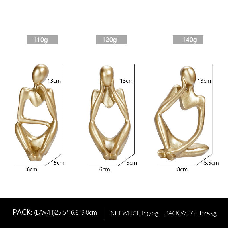 Abstract Thinker Sculpture Set - Elevate your home decor with this striking set of abstract thinker sculptures in a luxurious gold finish. Crafted from high-quality resin, these modern art figurines depict thought-provoking poses, perfect for adding a touch of sophistication to any room. Each piece measures 13cm (5.1in) in height, with individual weights of 110g, 120g, and 140g. Ideal for living rooms, offices, or study spaces, this set brings an artistic flair to your decor.