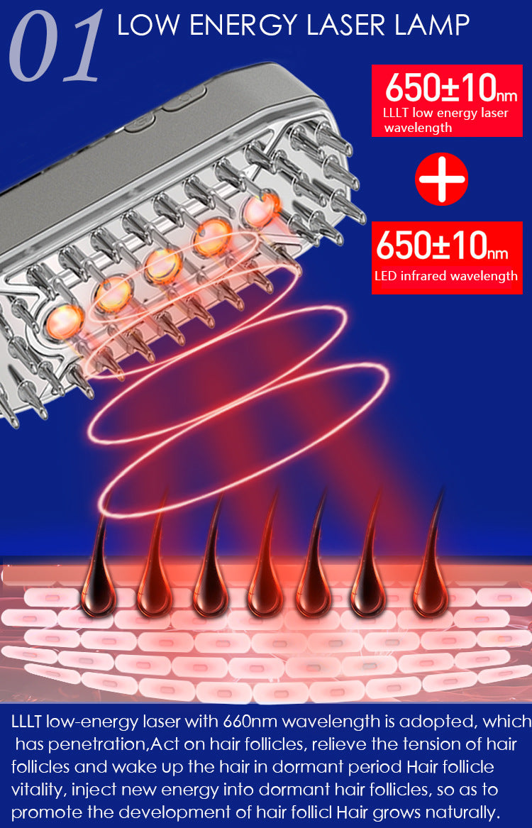- Low-Energy Laser Lamp (LLLT + Red Light): Utilizes 650±10nm LLLT low-energy laser and 650±10nm LED infrared wavelength to penetrate the scalp, act on hair follicles, relieve tension, and promote the development of dormant hair follicles.