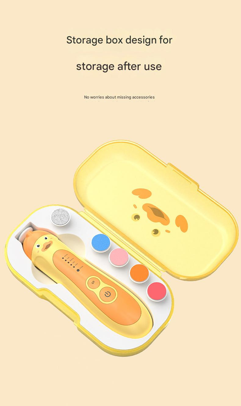 Ensure gentle and safe nail care for your baby and the whole family with our Electric Nail Trimmer Kit. This adorable duck-designed trimmer features 360-degree rotating grinding heads that smoothly file nails without harming delicate skin, preventing babies from scratching themselves. It offers 5 adjustable speed modes (Strong, Fast, Medium, Soft, Baby) to cater to different nail thicknesses and sensitivities, making it suitable for newborns, toddlers, children, and adults. The kit includes 6 interchangeable grinding heads: a wool polishing head for smoothing nail edges and polishing surfaces, a buffing/polishing head for cleaning cuticles and promoting nail growth, a fine grinding head for baby's fine nail repair, a precision grinding head for initial shaping (0-11 months), a coarse grinding head for calluses and dead skin around nails (12 months+ and adults), and a metal grinding head for initial shaping of adult nails. Conveniently USB Type-C rechargeable, it comes in a cute storage case to keep all accessories organized.