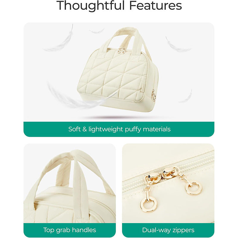 Beige Large Capacity Travel Toiletry Bag with Wide Opening - Puffy Nylon Makeup Organizer with Waterproof PVC Layer