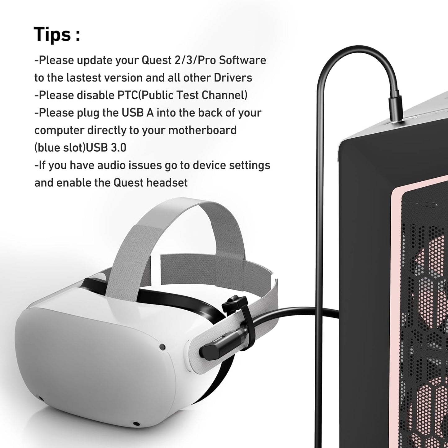Supports USB 3.0 transmission speeds for fast and stable data synchronization, delivering a smooth and uninterrupted VR gaming experience. The included Velcro strap secures the cable to your headset to prevent accidental disconnection. Note: For optimal performance, connect to a USB-A 3.1 or USB-A 3.0 port.