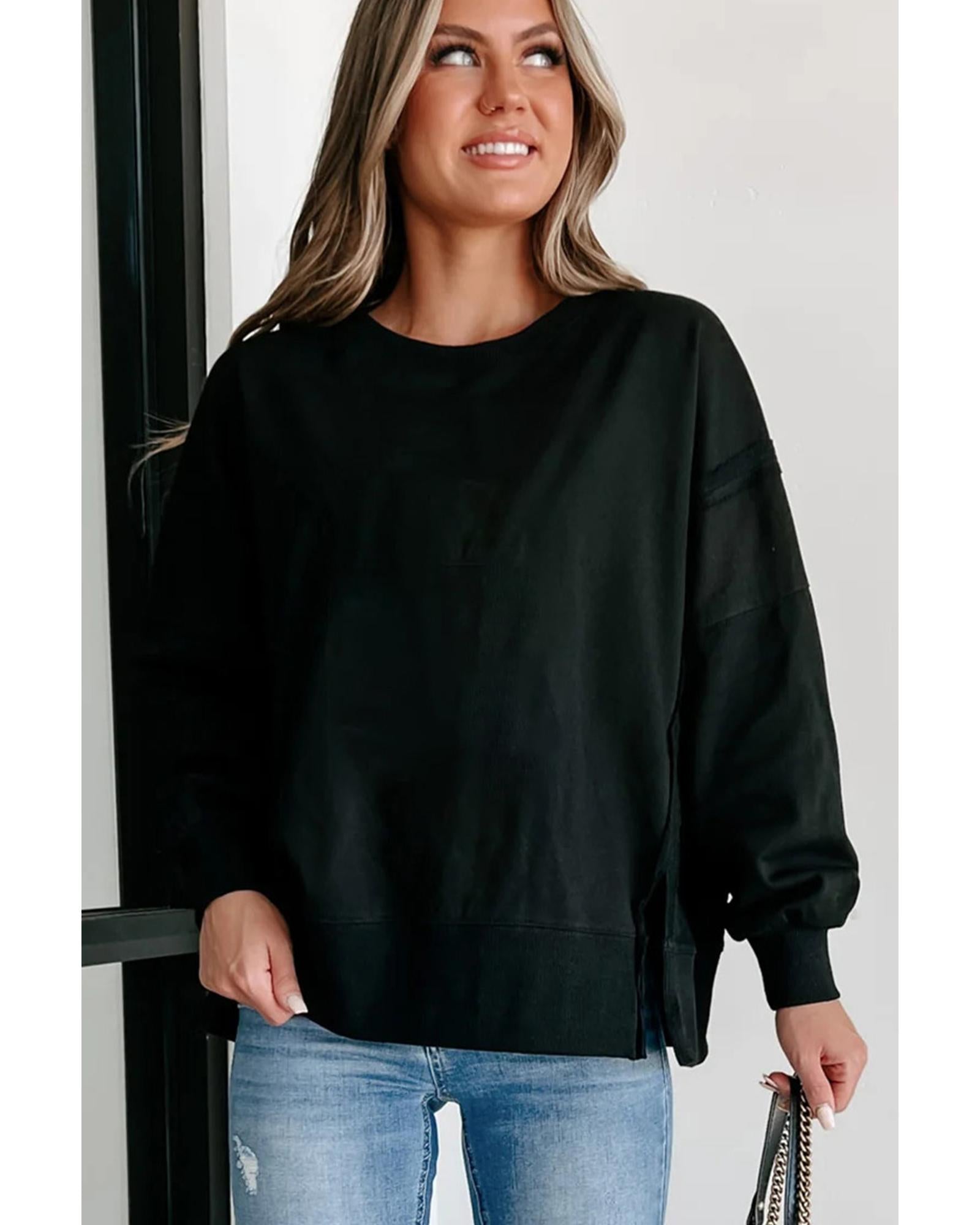 - Black Exposed Seam Drop Shoulder Round Neck Sweatshirt with Slits