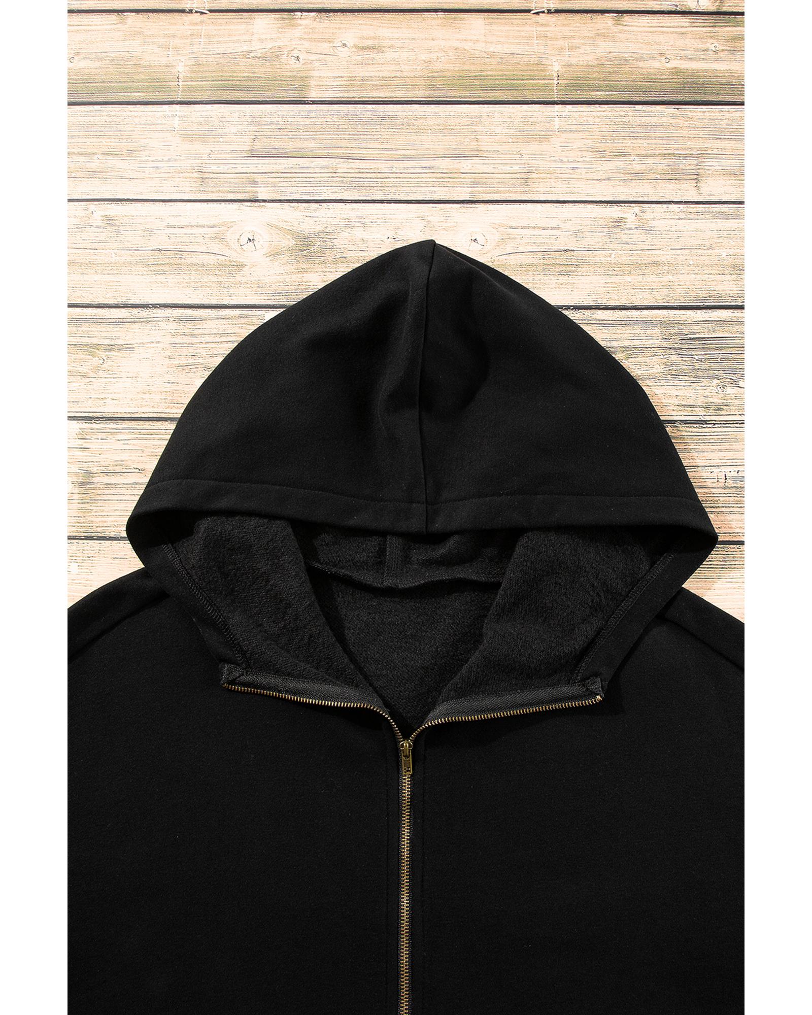 - Black Fleece Lined Half Zipper Kangaroo Pockets Loose Hoodie