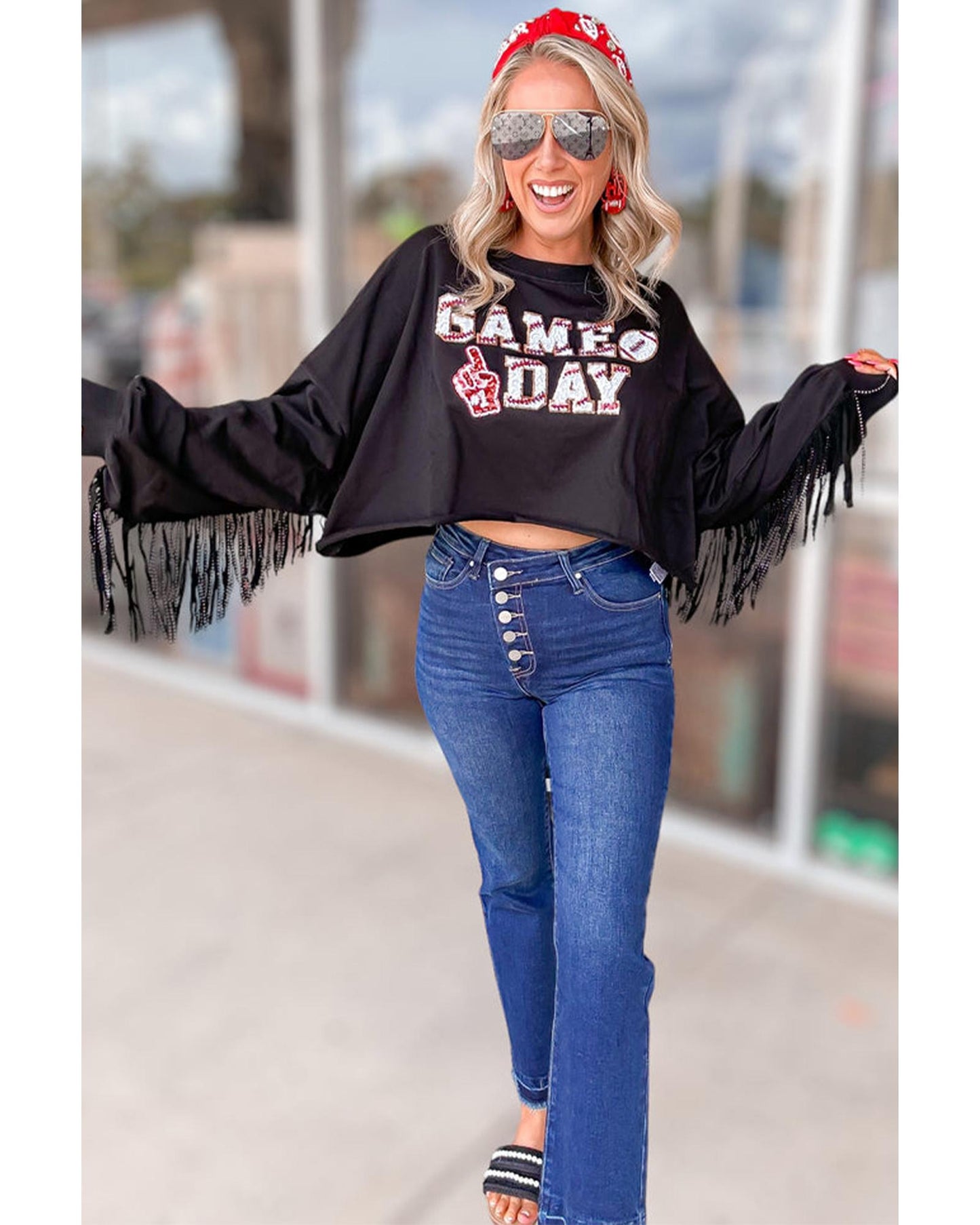 - Black GAME DAY Rugby Sequined Tasseled Cropped Sweatshirt