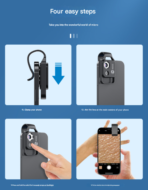 - Easy to Use - No App Needed: Enjoy hassle-free operation. Simply clip the lens over your phone's main camera, turn on the light, and start exploring. No special apps or software are required.