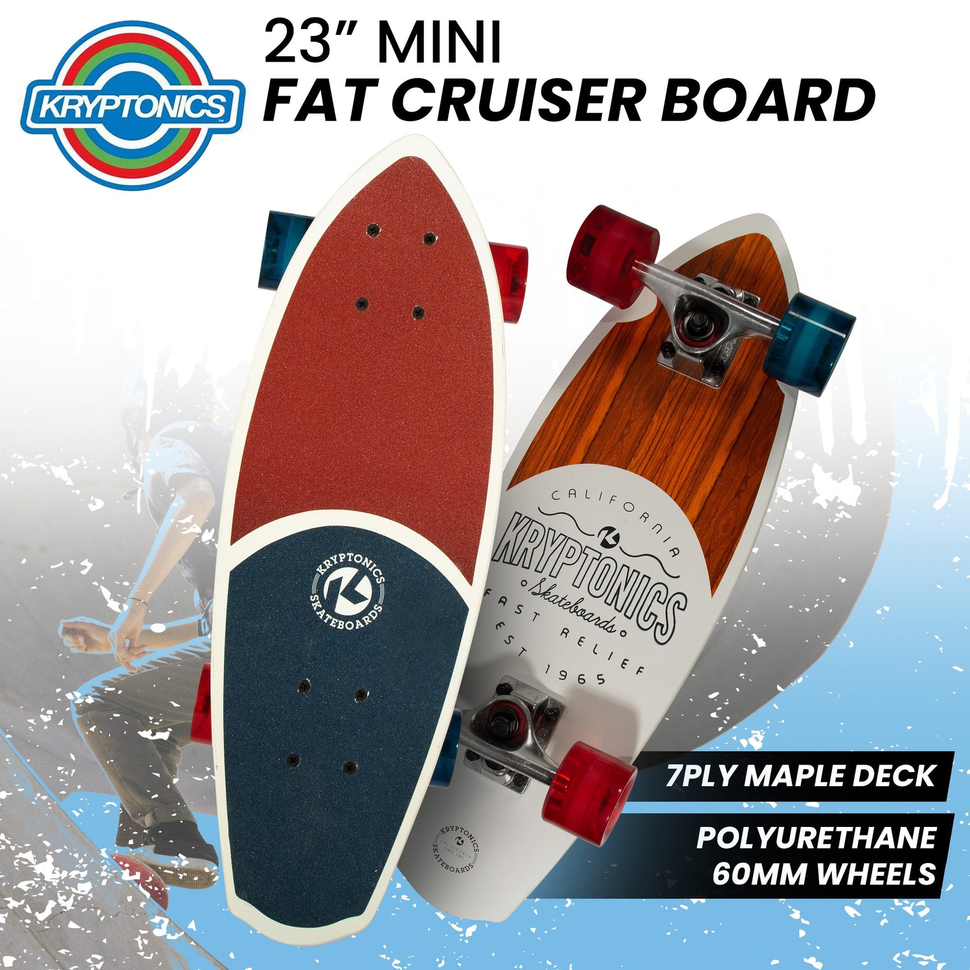 With the Kryptonics Mini Fat Cruiser Board, experience urban adventures like never before! Crafted for gnarly carving through the streets, this cruiser features a 23in x 7.75in mini fat wood deck, ensuring stability and control with its single kicktail design. Grip the road confidently with its 7-ply maple construction and 2pc split grip (80ab) tape, while the patented wheel lock keeps your board steady and prevents unwanted movement during storage. And with carbon steel ABEC 3 bearings, youll find yourself gliding effortlessly on concrete terrain!