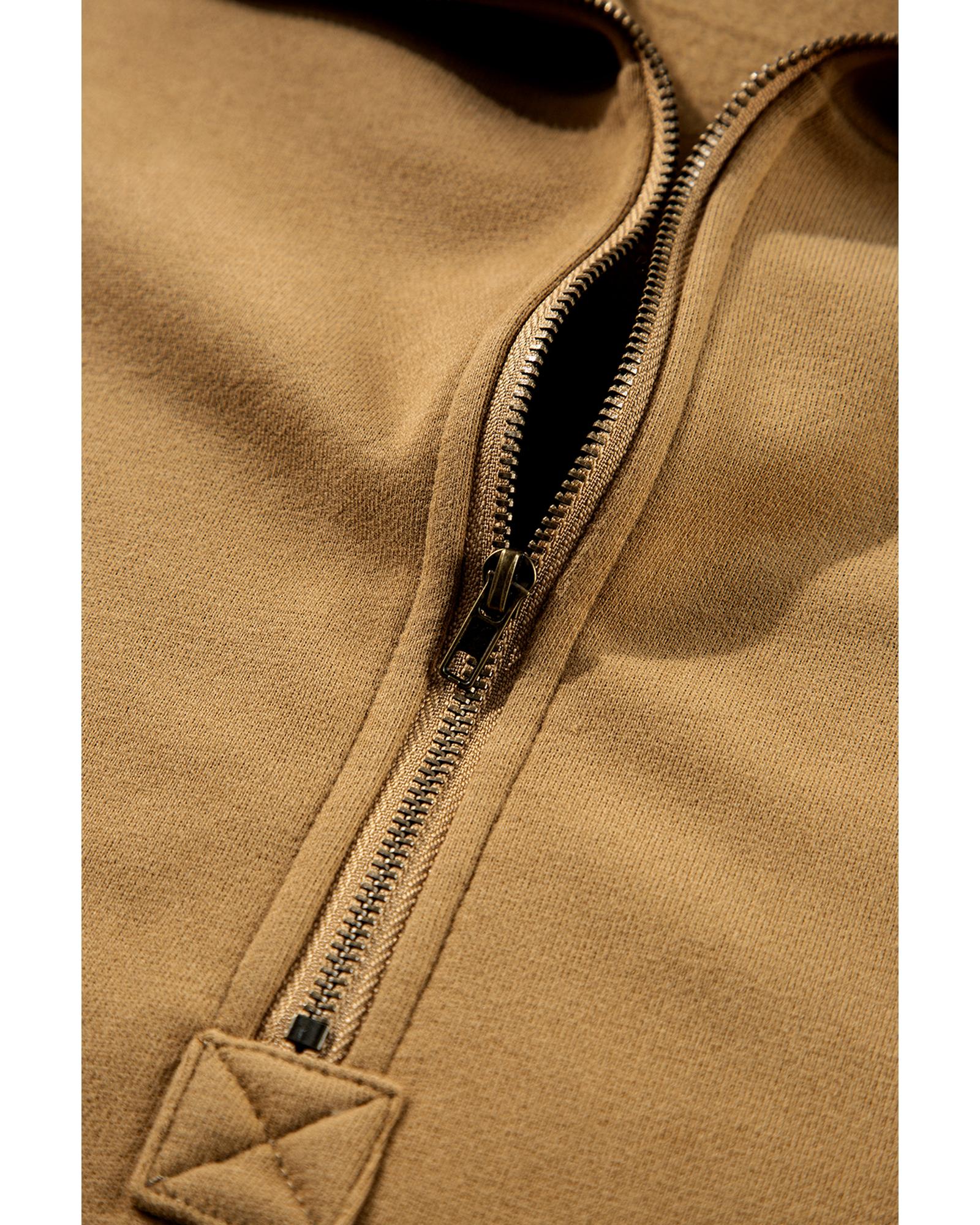 Brown Fleece Lined Half Zipper Kangaroo Pockets Loose Hoodie - L