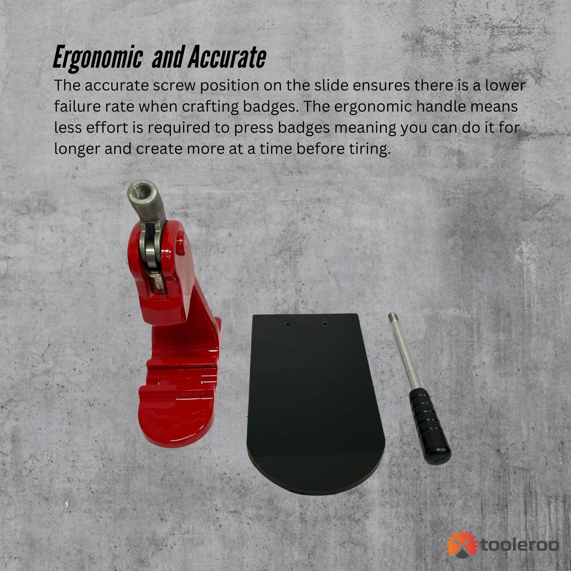 This badge maker is simple to use and learn. The accurate screw position on the slide ensures there is a lower failure rate when crafting badges. The ergonomic handle means less effort is required to press badges meaning you can do it for longer and create more at a time before tiring.
