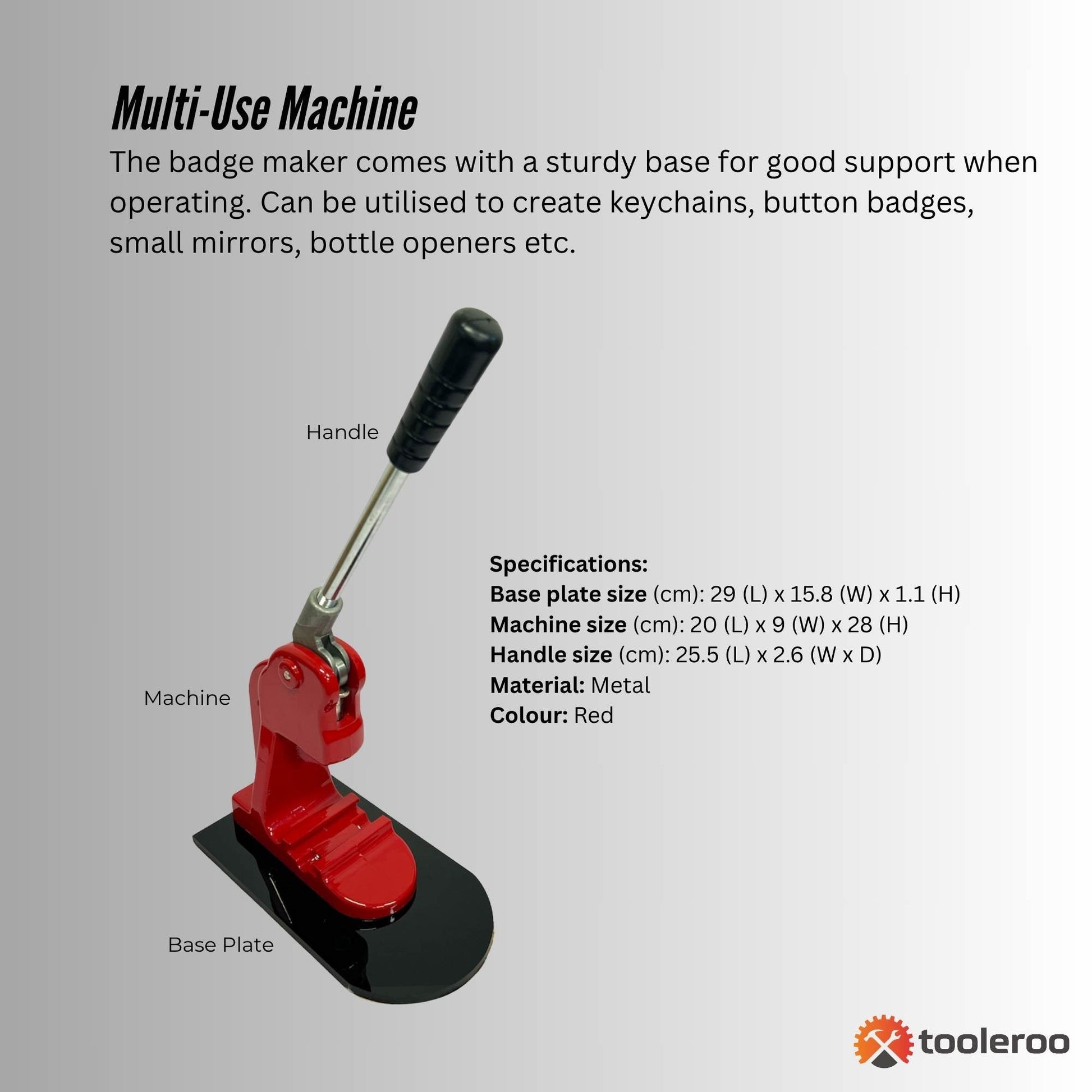 The badge maker comes with a sturdy base for good support when operating. Can be utilised to create keychains, button badges, small mirrors, bottle openers etc.
