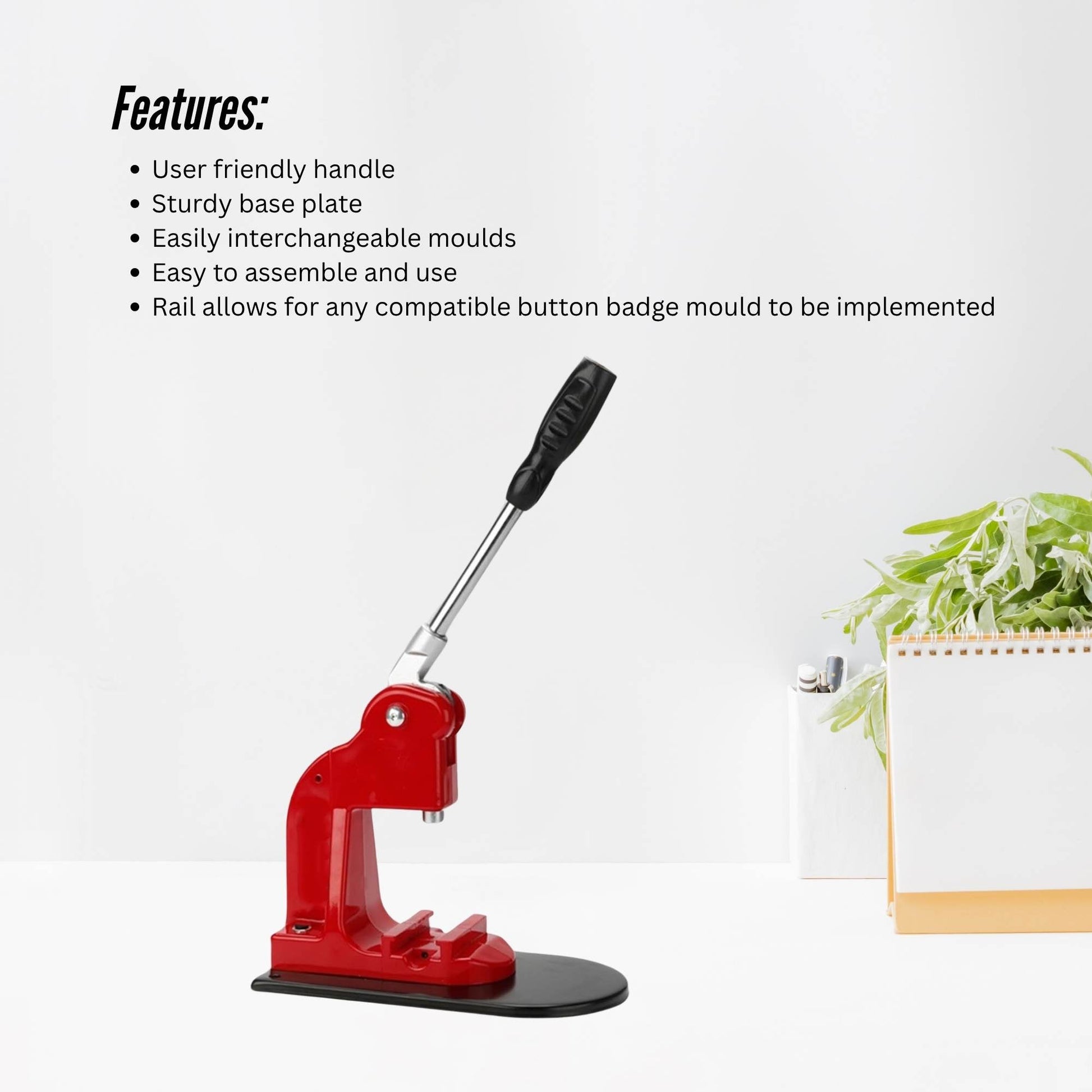 - Rail allows for any compatible button badge mould to be implemented
