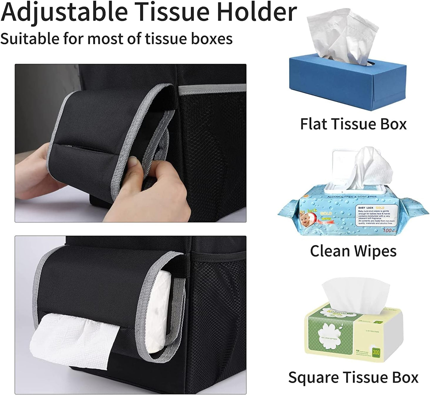 - This car storage bag is perfect for keeping your car interior neat and organized. It features two side mesh pockets, front pockets, and an adjustable tissue holder that can be secured to the headrest or center console. The large storage space can be used to store beverages, tissues, toys, bags, snacks, wet umbrellas, and more. With its collapsible shape, it's easy to store when not in use.