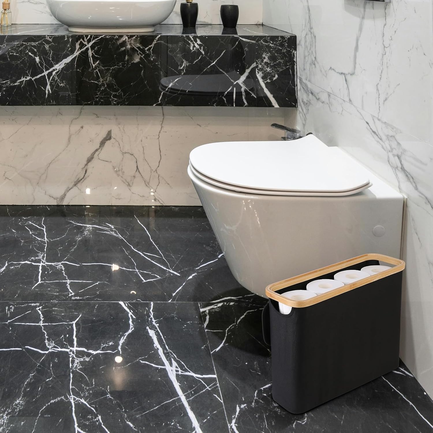 CARLA HOME Toilet Paper Storage Basket Holds Up to 12 Rolls with Bamboo Lid and Handle for RV Closet (Black)