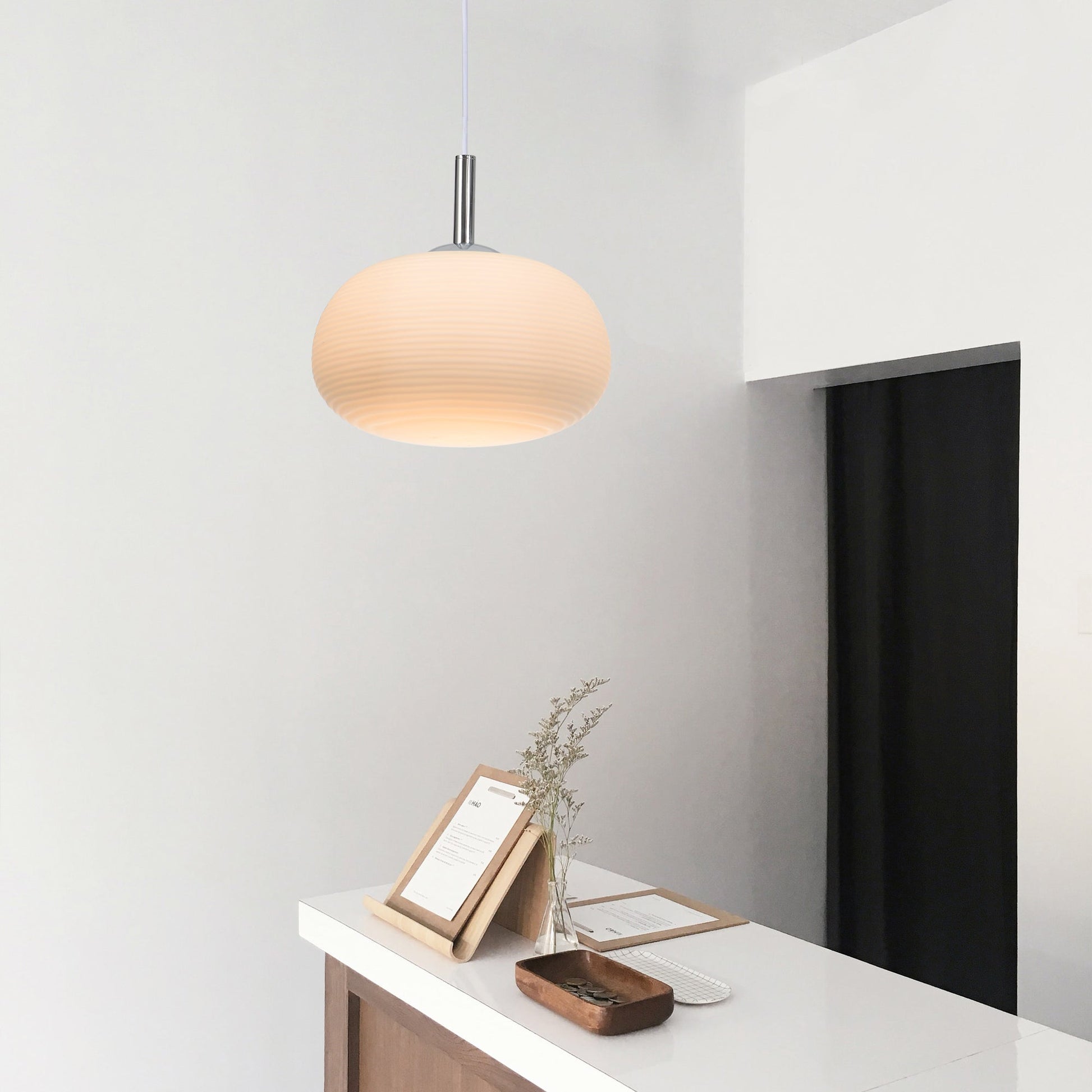 When illuminated, the frosted glass shade of the Celia Glass Pendant Light glows beautifully and produces a calming mood in the space it is installed. The shade also has an appealing ribbed design to add some texture, style and personality to the Celia Glass Pendant Light.