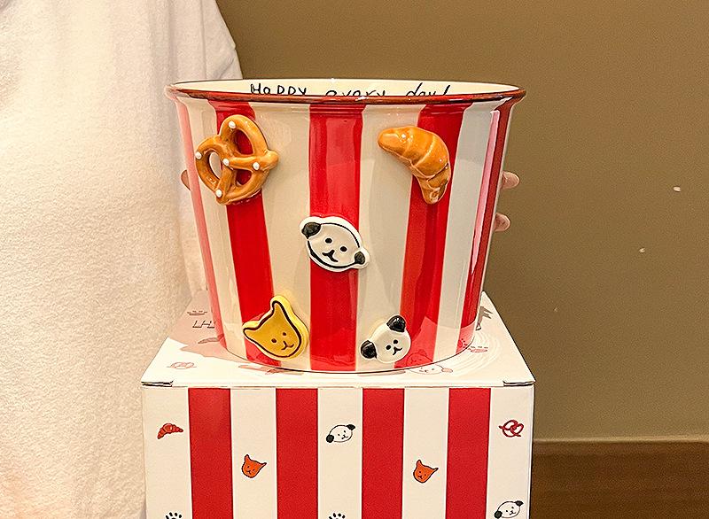 Elevate your instant ramen experience with this whimsical and charming striped ceramic noodle bowl. This large-capacity bowl features a delightful design with vertical stripes and is adorned with cute, three-dimensional appliqués of cartoon characters, pretzels, and croissants. Inside the rim, a hand-written style message reads "Happy every day!", adding a cheerful touch to your mealtime. The bowl boasts a smooth, delicate glaze on the inside and outside for easy cleaning, while the unglazed bottom provides an anti-slip design for stable placement on any surface. Beautifully packaged in a matching striped gift box, it's a perfect gift for noodle lovers, students, or as a wonderful treat for yourself. Ideal for instant noodles, ramen, soup, cereal, or even as a fun popcorn bucket.