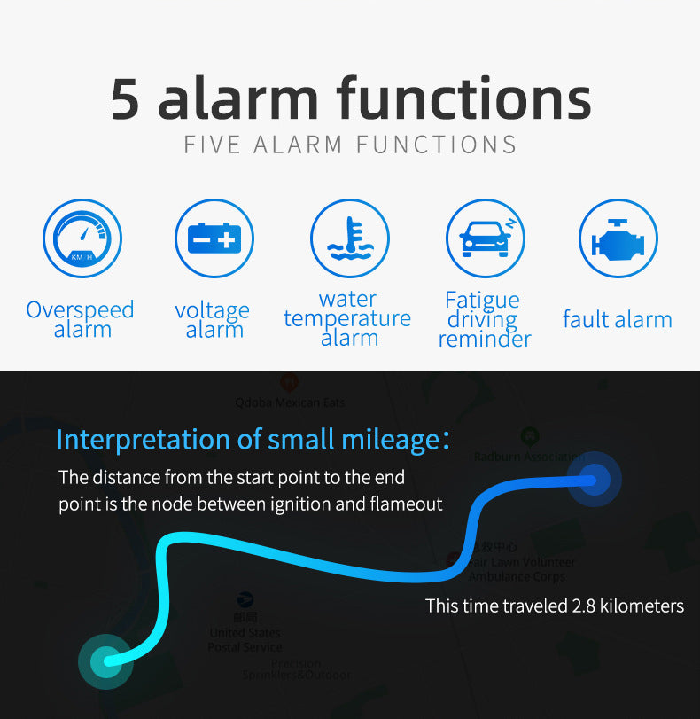 - 5 Alarm Functions: Includes Overspeed alarm, Voltage alarm, Water Temperature alarm, Fatigue Driving Reminder, and a general Fault alarm.
