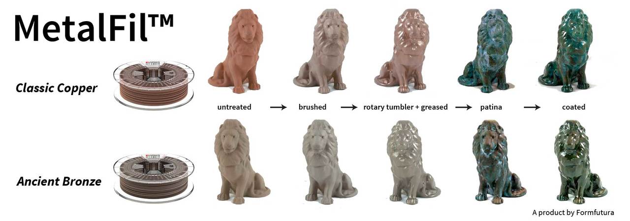 - Patina post-processing - You can create several patina effects on MetalFil - Classic Copper printed objects in just one day time. With an ammonia and soda treatment you can for instance easily create a beautiful ancient green/blue weathering effect on your copper object.