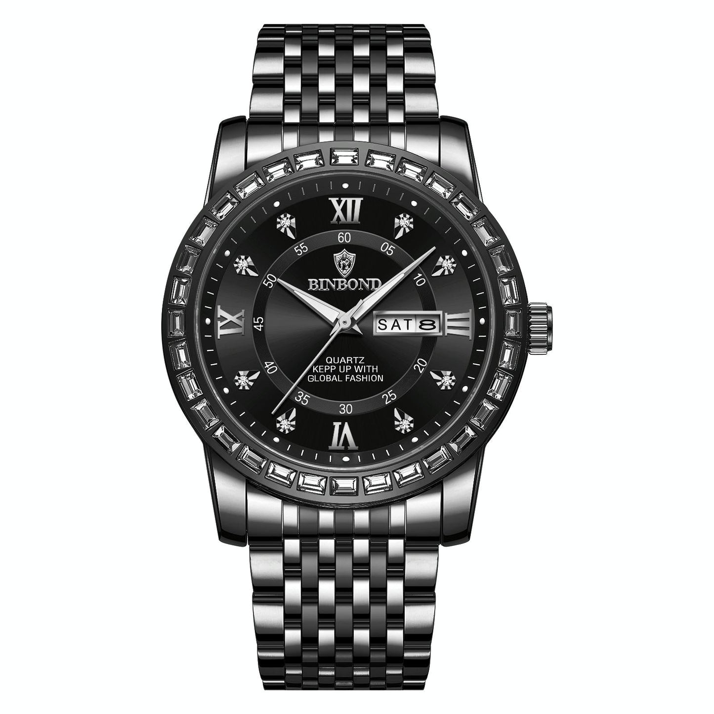 Diamond Dual-calendar Luminous Quartz Watch - B2202 - Black Steel-Black-White Nail