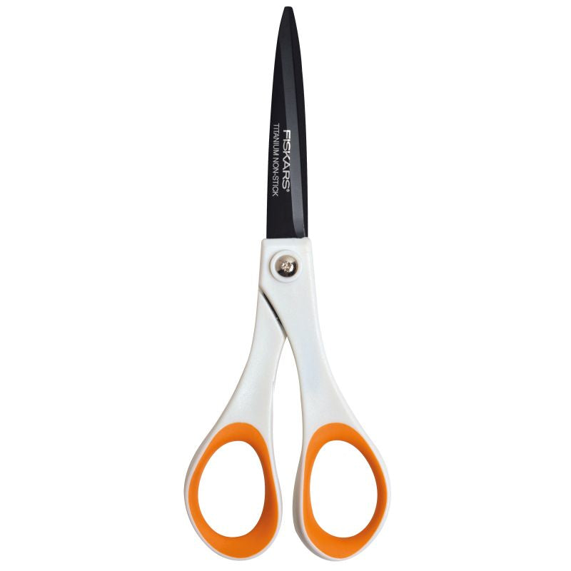 Fiskars Titanium Non Stick Universal 18cm Scissorlast longer : 3 times harder than regular blades. Contoured handles with Softgrip for comfortable grip. Non-Stick coated blades to prevent most adhesives from sticking to the blades.
