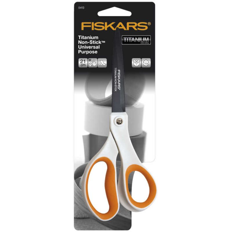 Fiskars Titanium Non Stick Universal 21cm Scissorlast longer : 3 times harder than regular blades. Contoured handles with Softgrip for comfortable grip. Non-Stick coated blades to prevent most adhesives from sticking to the blades.