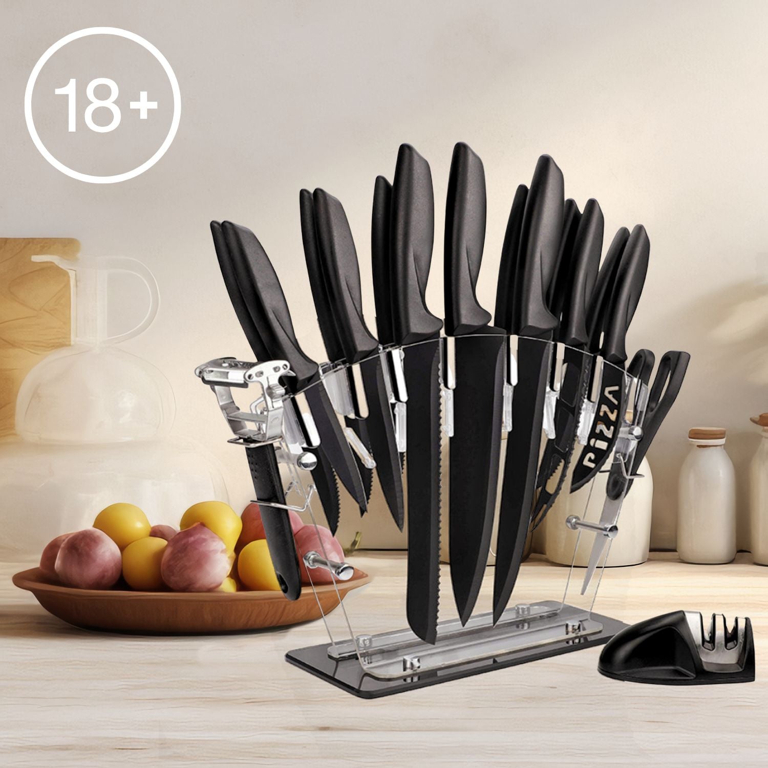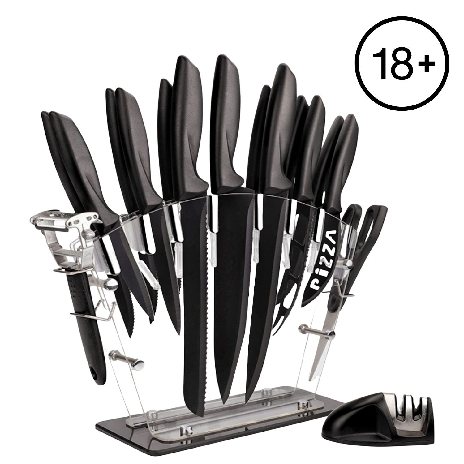 GOMINIMO 17 Piece Kitchen Knife Set with Acrylic Knife Block (Black and Transparent)