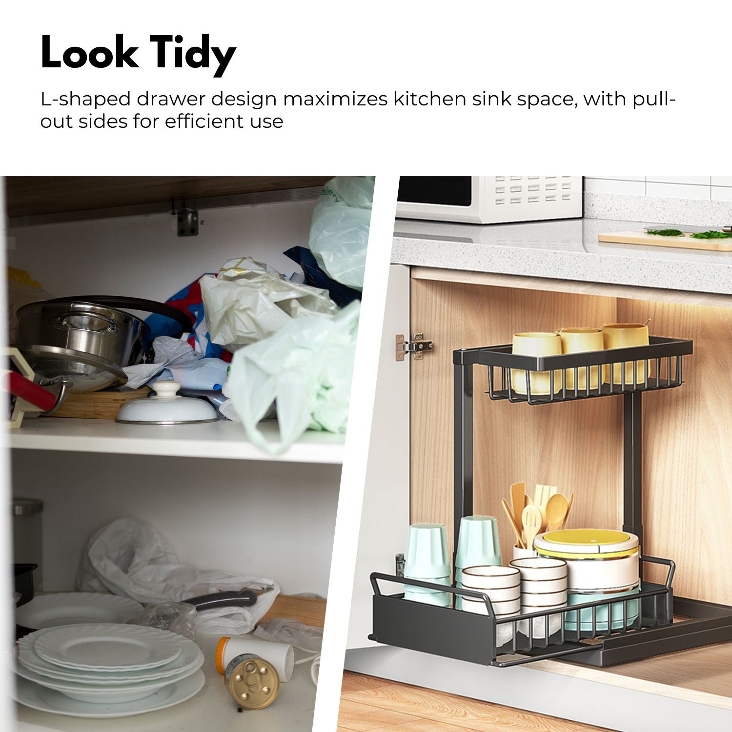 Optimize Sink Space: This item adds valuable storage space under the sink, optimizing your kitchen or bathroom for a tidier and more functional environment.